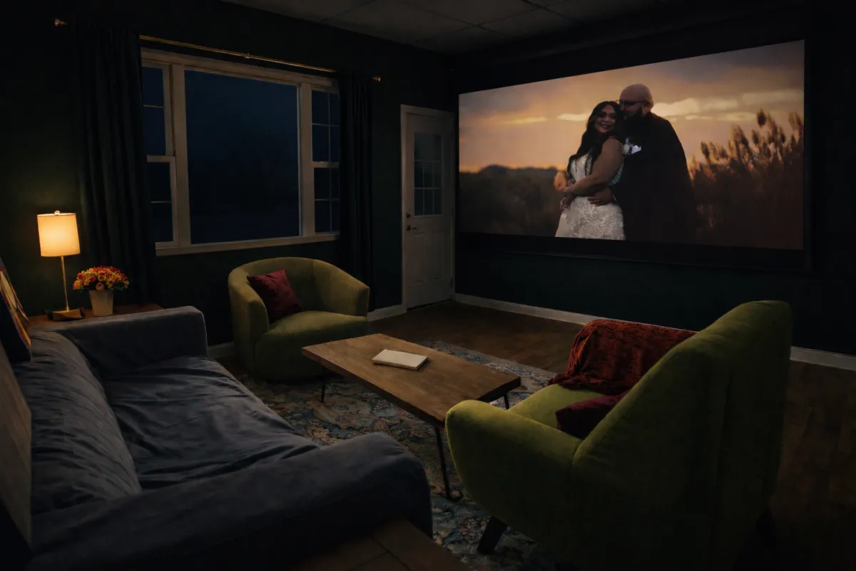 After your story is complete, you’re invited into the studio for a private cinematic premiere. The lights dim, champagne is poured, and you relive your day projected larger than life on our theater screen. Your story becomes a shared ritual that's intimate, emotional, unforgettable.